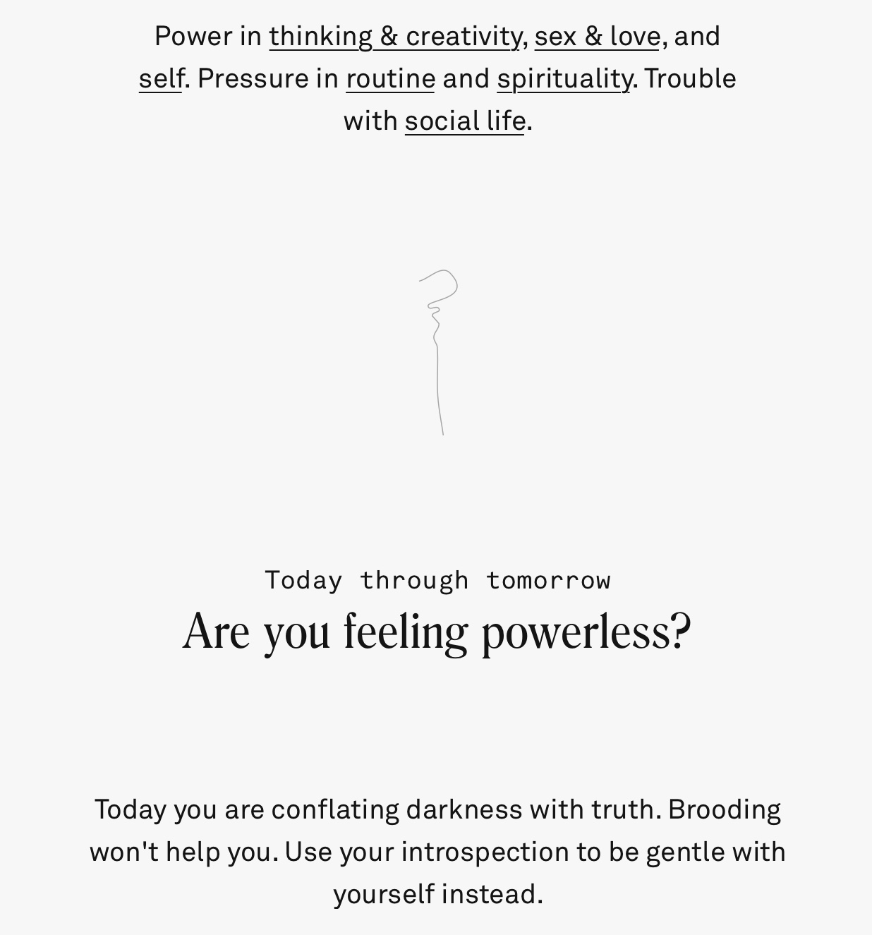 Power in thinking & creativity, sex & love, and self. Pressure in routine and spirituality. Trouble with social life. That’s today’s forecast, apparently. I have a confession: I can’t stop checking my Co-Star. For those unfamiliar, Co-Star is an astrology app that, after entering your exact date and time of birth, spits out your birthContinue reading "I’m a sceptic who’s obsessed with her horoscope"